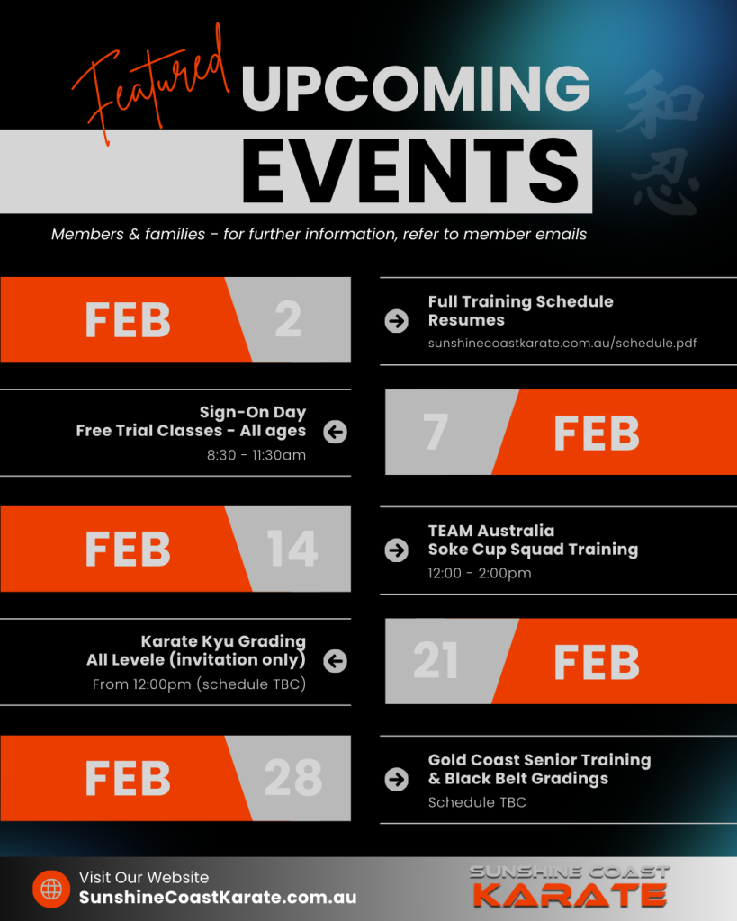 Training Schedule: https://www.sunshinecoastkarate.com.au/schedule.pdf